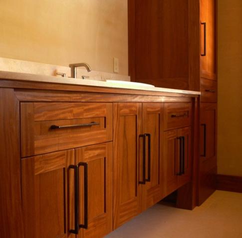 Roger Foggia & Marie Josee Salva’s beautiful cabinetry in Sapele & African Mahogany will be used for both the vanity and for a panel for the front of the bath.