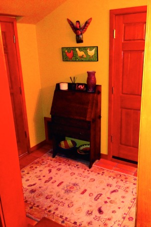 The art works are important to us.  The painting just outside this door was done by Pacific Northwest artist, Mary Moore Baileywww.marypaints.com; the pastel of the coastal foothills above Skyline Drive not far from Pacifica, California hangs over the bed,  by JoAnne HorsfallBeasley who died in 2006. We bought it just before moving to Bellingham at the end of 2004 from The Main Gallery in Redwood City.  We also purchased two of the Raku pots in the next photograph at the gallery from potter Jeff Carlick. The small, lidded Raku pot is an early example of work by our brilliant nephew, Tim McMullen.  He is one three partners in Silica Studioswhere they provide both gallery and studio space.  They also teach.  It’s a great place to learn on every level!  The large plate in the center is by Gene Buckley of Stony Clearing Studio here in Bellingham.  We also have pots by his wife, Cheryl Lee, one on the table through the doorway under Mary’s painting.