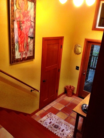 Here’s another view from the foyer. You can see the bathroom door next to the closet.  You can also see that in addition to the color of dried blood, baby diarrhea was chosen to accent its architecture.