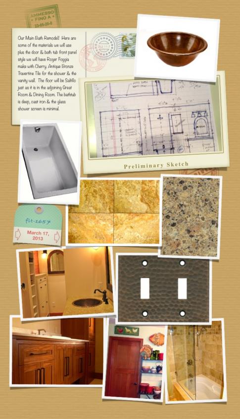Below are photos of elements of the design for our main bath remodel. Some photos are of an element in use in another home, some are from our home because we are using similar materials for the sake of continuity and harmony of design. In other cases, I have tried to choose examples that are similar enough to what we are doing to give readers a feel for what the final result will be.